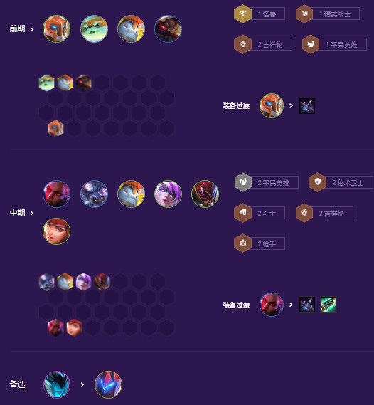 开局抢攻速或大剑先找轻语和科技枪。前期过渡后排最优是希维尔赛娜2枪或者德莱文。前排最优是2星的2斗士或者2护卫。然后再挂2吉祥物或者配点怪兽等质量卡。