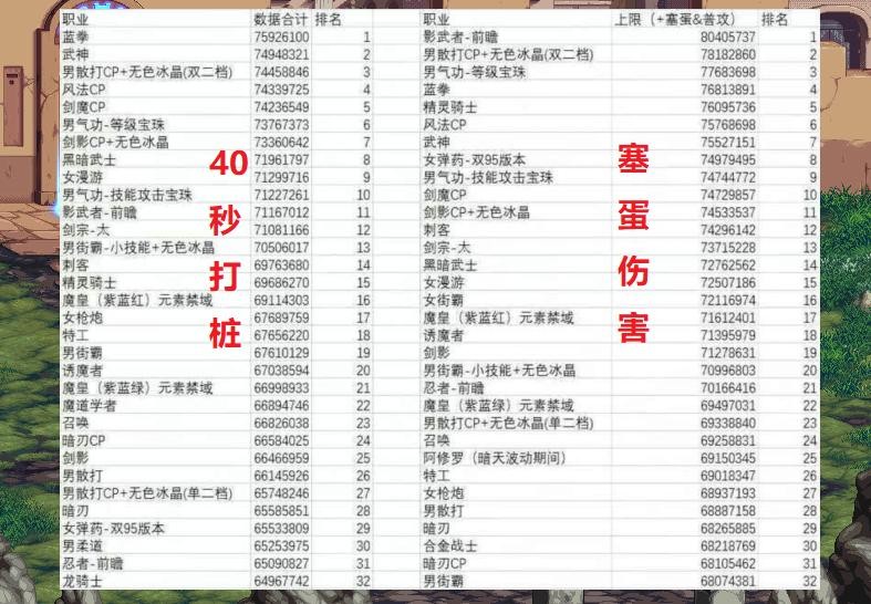 然后重点看一下排名,40秒打桩数据前十名职业为:蓝拳、武神、男散打、风法CP、剑魔CP、男气功(等级宝珠)、剑影CP、黑暗武士、女漫游、以及男气功(技攻宝珠)。