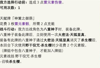 1.天赋牌「神篱之御荫」:花费3枚雷元素骰,所需2点充能。战斗行动:我方出战角色为八重神子时,装备此牌。八重神子装备此牌后,立刻使用一次大密法·天狐显真。装备有此牌的八重神子通过大密法·天狐显真消灭了杀生樱后,本回合下次使用野干役咒·杀生樱时少花费2个元素骰。(牌组中包含八重神子,才能加入牌组),元素战技-野干役咒杀生樱—召唤杀生樱。