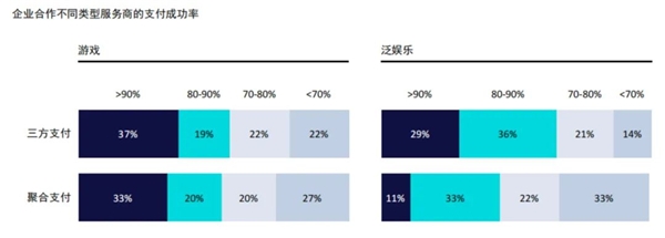 据艾瑞咨询的调研数据,三方收单机构在支付成功率上表现优异,特别是在泛娱乐领域:29%的泛娱乐企业支付成功率大于90%。而在与非收单行的聚合支付公司合作的企业中,支付成功率大于90%的比例仅11%。