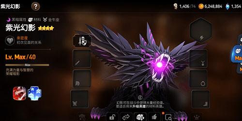 2、紫光初始四星,由于升级快建议玩家们作为角色升6星的材料使用,性价比会更高。幻影狼幻影狮子这些越后期使用价值越高。