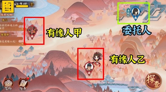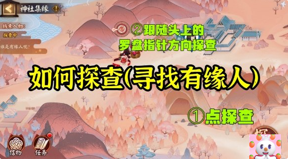 1、进入活动(点庭院小黑猫猫进入)后,点击探查,然后跟随头顶罗盘指针所指方向,寻找有缘人。