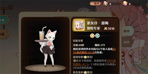 第四个值得推荐的猫灵是茶女仆甜梅,她的攻击实力较为强势,培养起来没有任何难度,基础攻击在5010,魔耗在379,她可以造成235的物理攻击效果,同时也会有一定的连锁攻击能力,智慧叠加88,虽然没有前面几个猫灵强势,但是她却拥有持续消耗的效果,可以造成一定的烫伤伤害,让对手无处可躲。