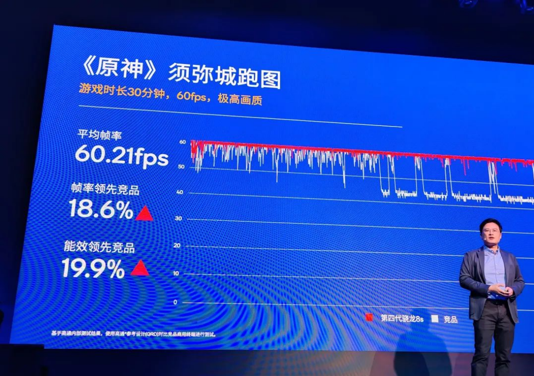 在实测中,第四代骁龙8s中运行《王者荣耀》等竞技类游戏时,几乎可以保持全程的满帧运行(120fps),在平均帧率上比竞品平台领先约6%。而在《原神》等大型开放世界3D游戏中,第四代骁龙8s不仅能够保持长时间的满帧运行,同时帧率还比竞品领先18.6%,并且有着更低的实时功耗。